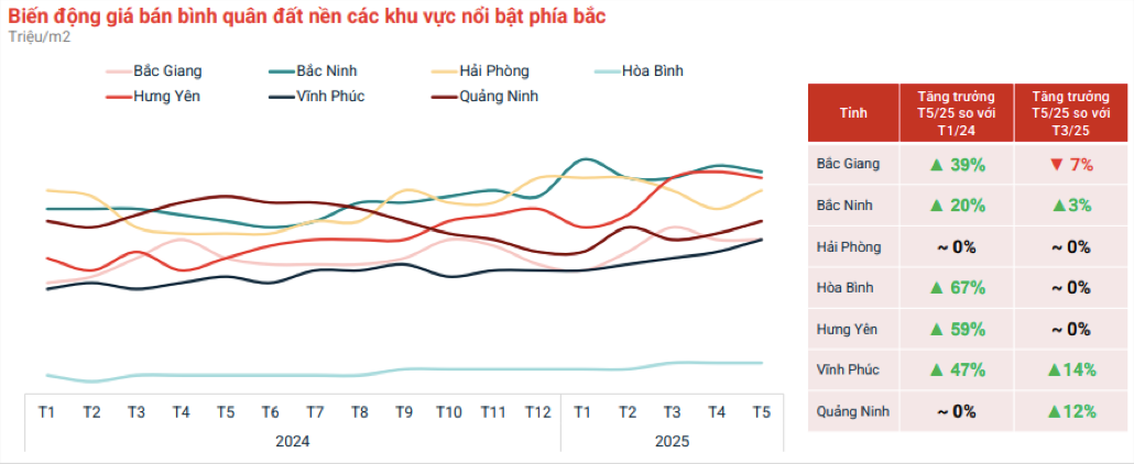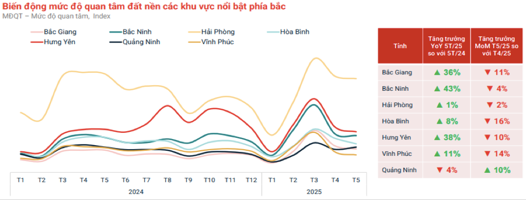 Trong 5 tháng đầu năm 2025, mức độ quan tâm đất nền ở các tỉnh miền Bắc (ngoài Hà Nội) tăng trưởng so với cùng kỳ năm ngoái, thể hiện rõ rệt nhất tại Bắc Ninh, Hưng Yên và Bắc Giang. Theo đó, Bắc Ninh dẫn đầu với mức tăng 43% so với 5 tháng đầu năm 2024, kế tiếp là Hưng Yên 38% và Bắc Giang 36%. Các thị trường như Vĩnh Phúc và Hòa Bình vẫn duy trì đà tăng nhẹ, lần lượt 11% và 8%. Hải Phòng gần như đi ngang khi tăng 1%, còn Quảng Ninh giảm 4% so với cùng kỳ năm ngoái.