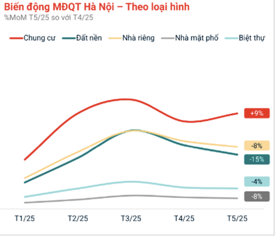 Trong tháng 5, mức độ quan tâm đối với căn hộ chung cư tại Hà Nội và các tỉnh miền Bắc ghi nhận tăng mạnh, lần lượt 9% và 19% so với tháng trước đó. Đây là tín hiệu cho thấy tâm lý người mua đang quay lại thị trường, đặc biệt ở các tỉnh thành giáp ranh Hà Nội - nơi giá còn hấp dẫn và nguồn cung mới đang mở rộng.