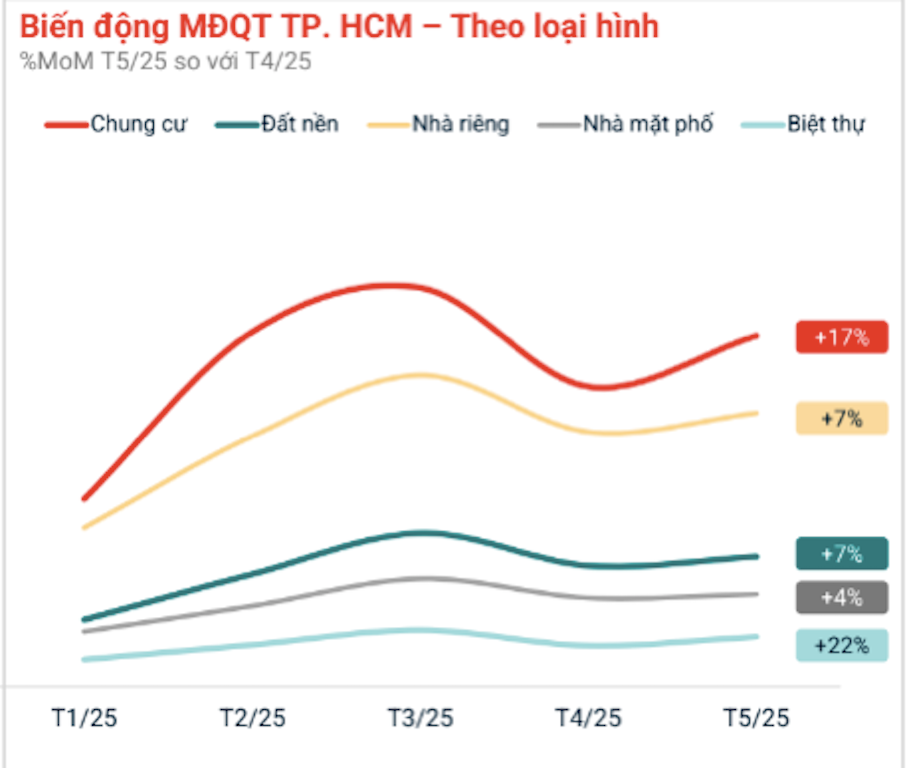 Dữ liệu từ Batdongsan.com cho biết, so với tháng 4, lượng người quan tâm chung cư TPHCM tăng 17%, đất nền và nhà riêng cùng tăng 7%, nhà mặt phố tăng 4% và biệt thự tăng 22%.