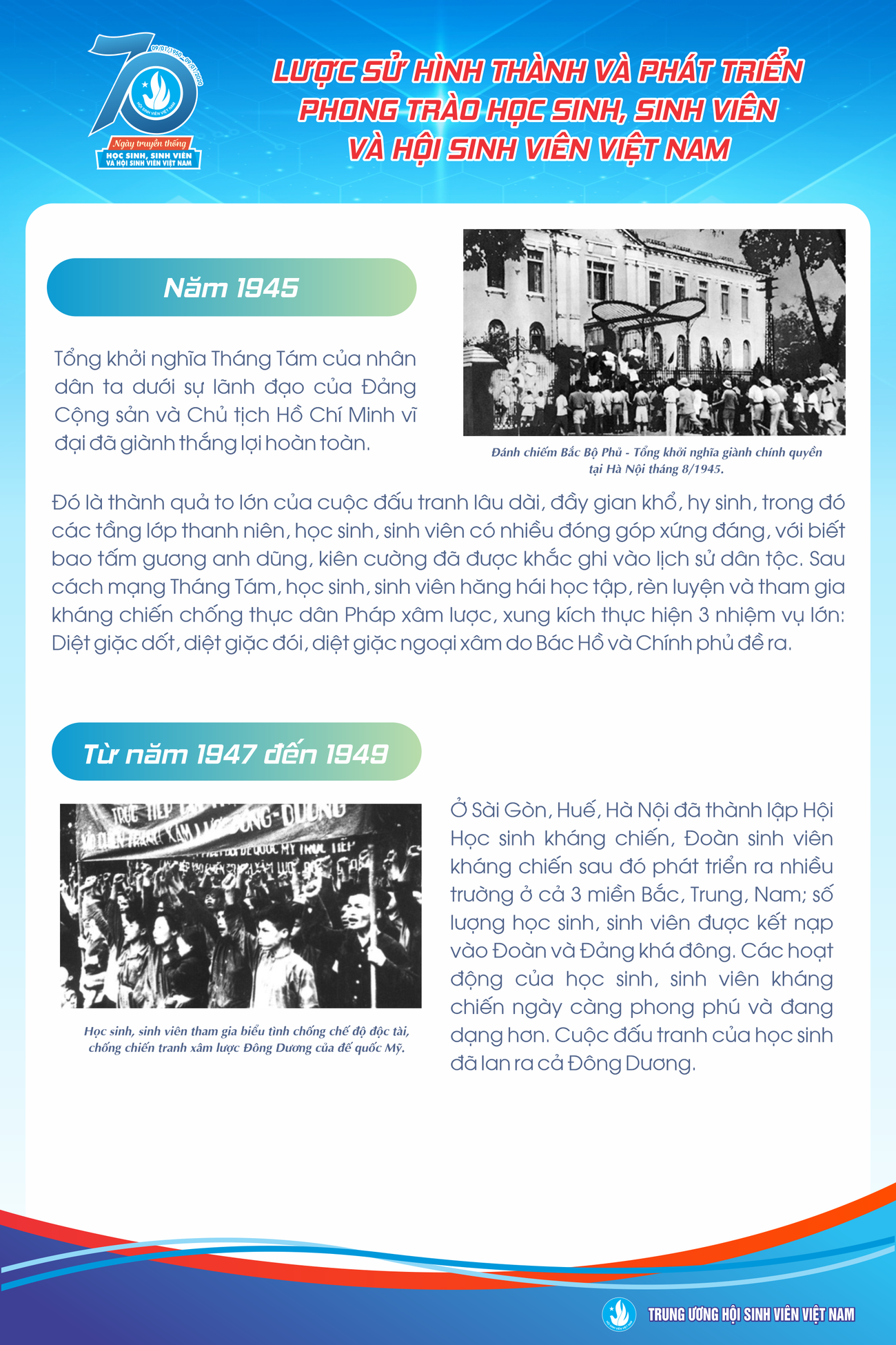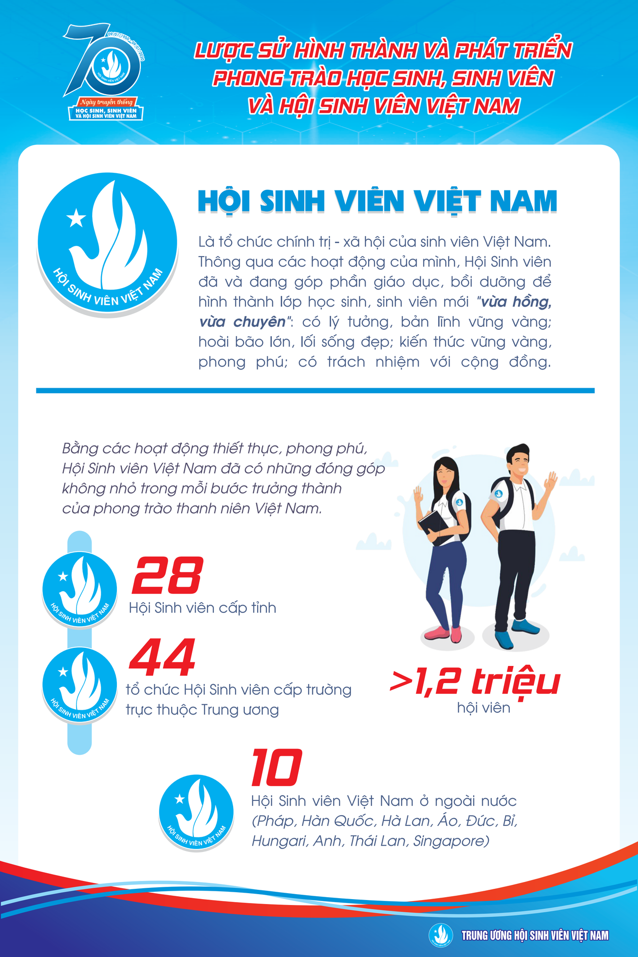 Nhân kỷ niệm 70 năm Ngày truyền thống học sinh, sinh viên, Hội Sinh viên Việt Nam (9/1/1950 – 9/1/2020), T.Ư Hội SVVN thiết kế bộ infographic lược sử quá trình hình thành và phát triển của phong trào học sinh, sinh viên và tổ chức Hội Sinh viên Việt Nam. Báo Tiền Phong trân trọng giới thiệu: