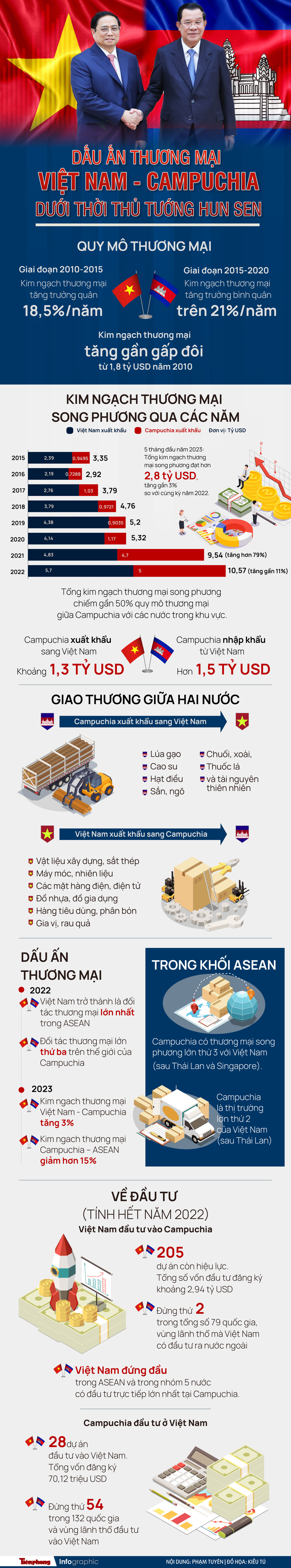 TPO - Trong giai đoạn 2010 - 2023, quan hệ thương mại Việt Nam - Campuchia có dấu ấn đặc biệt. Việt Nam là đối tác thương mại lớn nhất của Campuchia. Từ năm 2022, Việt Nam trở thành là đối tác thương mại lớn nhất trong ASEAN và là đối tác thương mại lớn thứ ba trên thế giới của Campuchia, sau Trung Quốc và Mỹ.