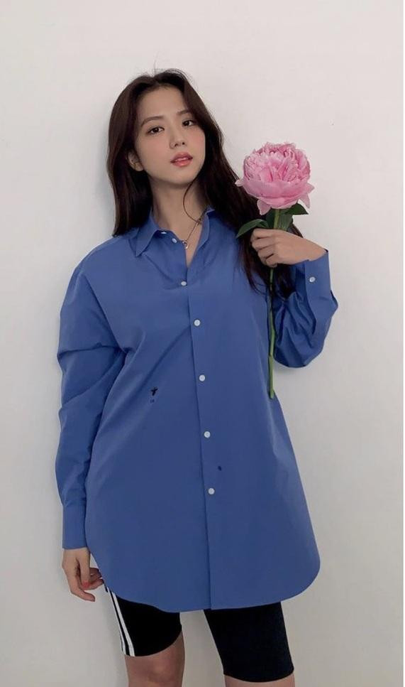 Jisoo còn có một cách phối đồ cực độc đáo nữa là diện sơ mi dáng dài với quần legging lửng hoặc quần tập thể thao như thế này.