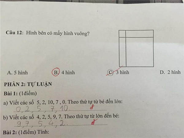 Đề bài là một hình vẽ, và câu hỏi được đặt ra là có bao nhiêu hình vuông trong hình vẽ này. Khi học sinh khoanh tròn câu trả lời là 3, và cô giáo đưa ra câu trả lời là 4, lập tức bài toán này trở thành chủ đề tranh luận của rất nhiều cư dân mạng.