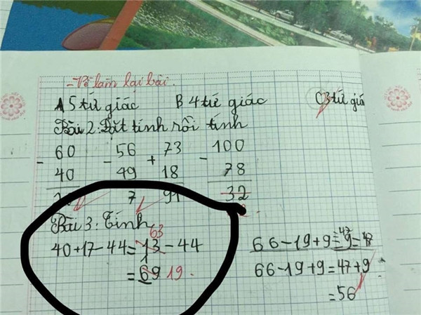 Đến cô giáo cũng cộng nhầm 40+17= 63? (Ảnh: Internet)