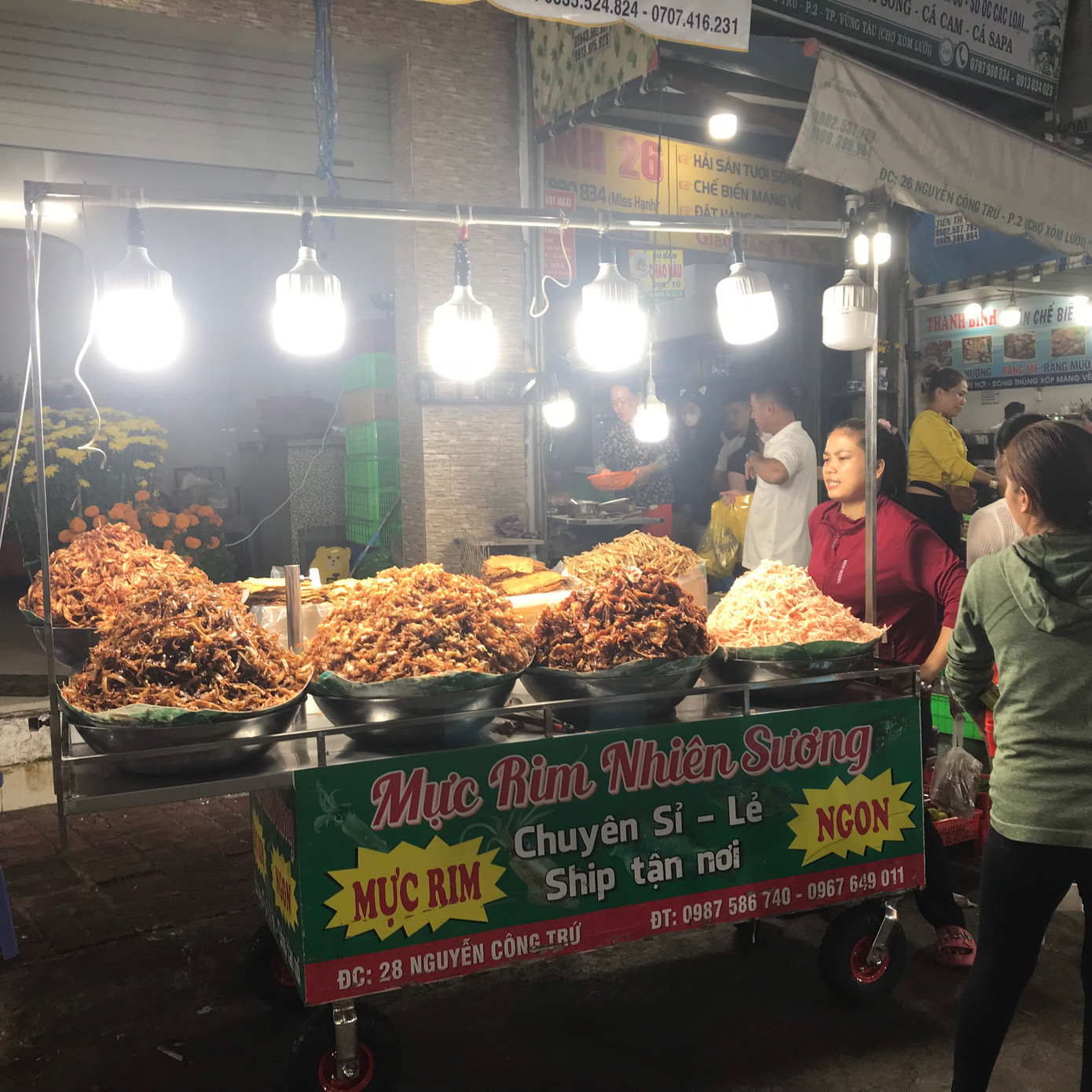 Chợ chủ yếu bán các loại hải sản tươi sống nhưng khách cũng có thể mua hải sản tươi sống và nhờ các cơ sở chế biến chín mang về. Thực đơn của mỗi cửa hàng hải sản đều phong phú và đa dạng như: càng cua sốt me, ghẹ hấp, cá sòng nướng, sò huyết xào sa tế, sò điệp mỡ hành, ốc mỡ cháy tỏi, sò quạt nướng mỡ hành, tôm tích rang muối, ngao xào bơ cay,…