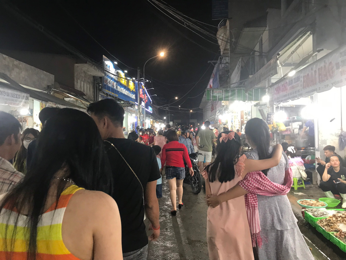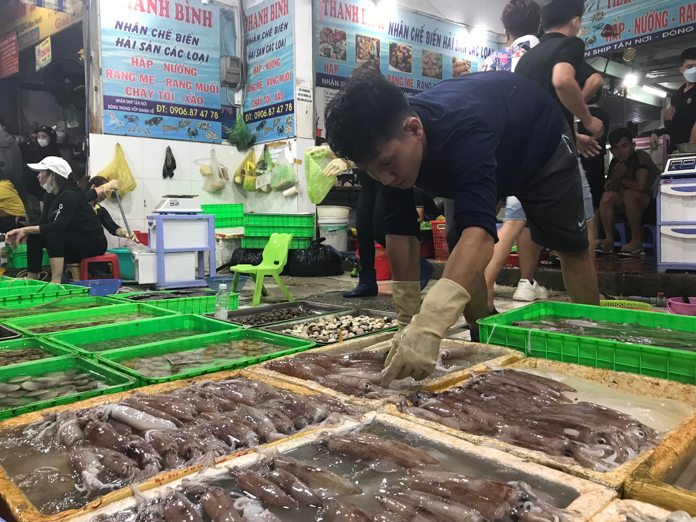 | Các bạn trẻ mua hải sản đợi chế biến mang về. |