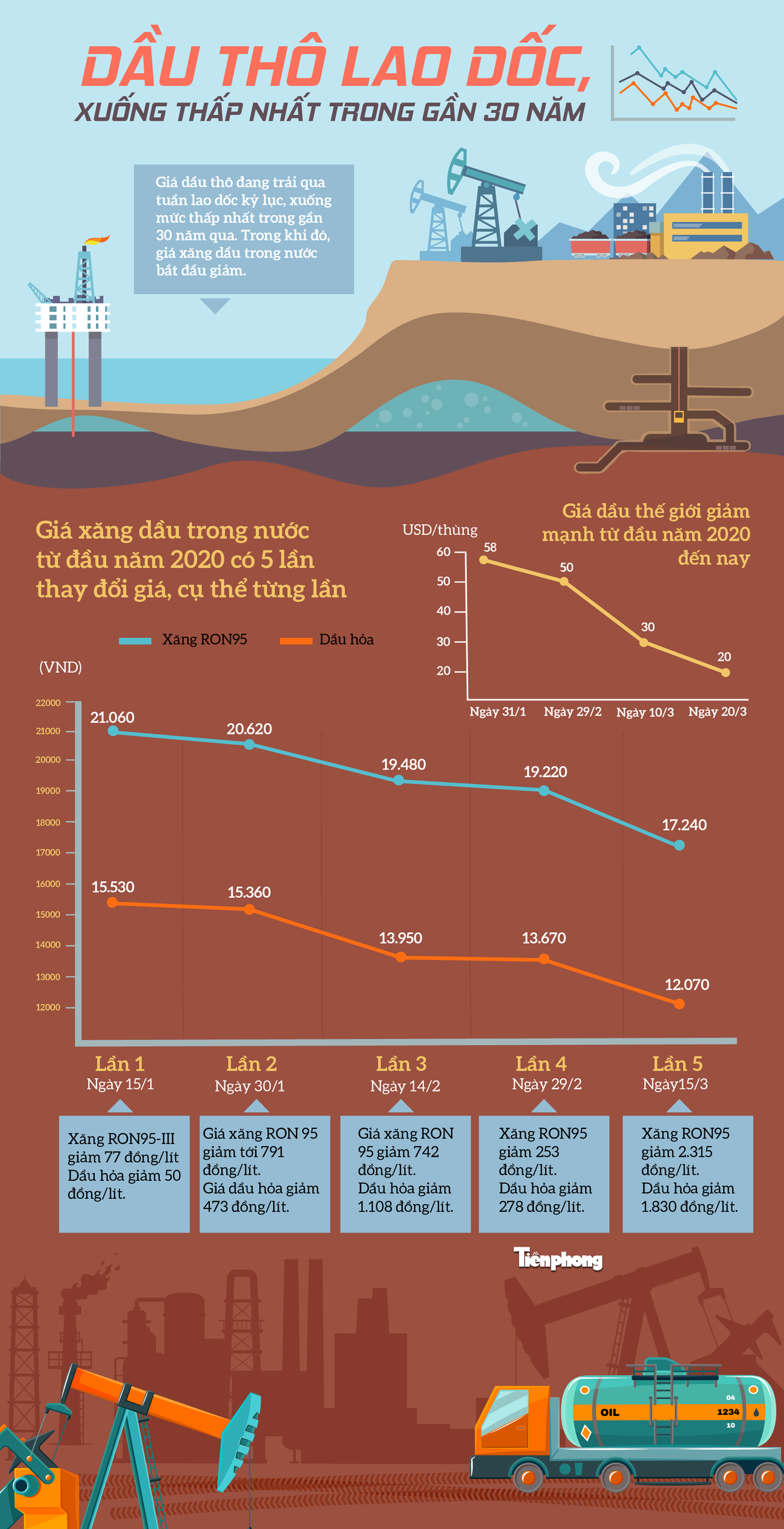 TPO - Giá dầu thô đang trải qua tuần lao dốc kỷ lục, xuống mức thấp nhất trong gần 30 năm qua. Trong khi đó, giá xăng dầu trong nước bắt đầu giảm.