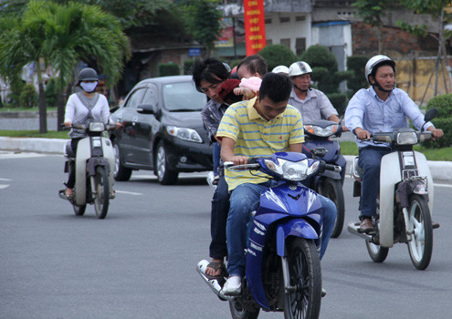 Chở trẻ em vẫn coi thường tính mạng, không mũ, lái một tay, nhắn tin điện thoại