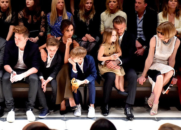 Cả gia đình David Beckham trong một buổi diễn thời trang. Ngồi ngoài cùng bên phải là bà chủ tạp chí Vogue Mỹ 66 tuổi - Anna Wintour