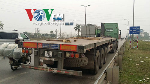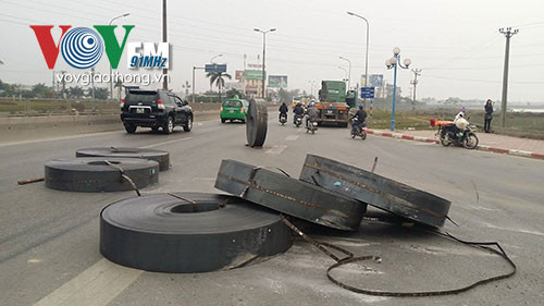 Khoảng 6h30p sáng nay (30/1), tại khu vực cao tốc Thăng Long - Nội Bài (Hà Nội), đã xảy ra 1 sự cố giao thông liên quan đến xe đầu kéo chở vật liệu xây dựng. Khi xe đầu kéo mang BKS: 29R - 018.96 chở theo nhiều cuộn thép đang lưu thông trên đường bất ngờ dây chằng hàng đã bị đứt, khiến nhiều cuộn thép nặng hàng tấn rơi thẳng xuống lòng đường.