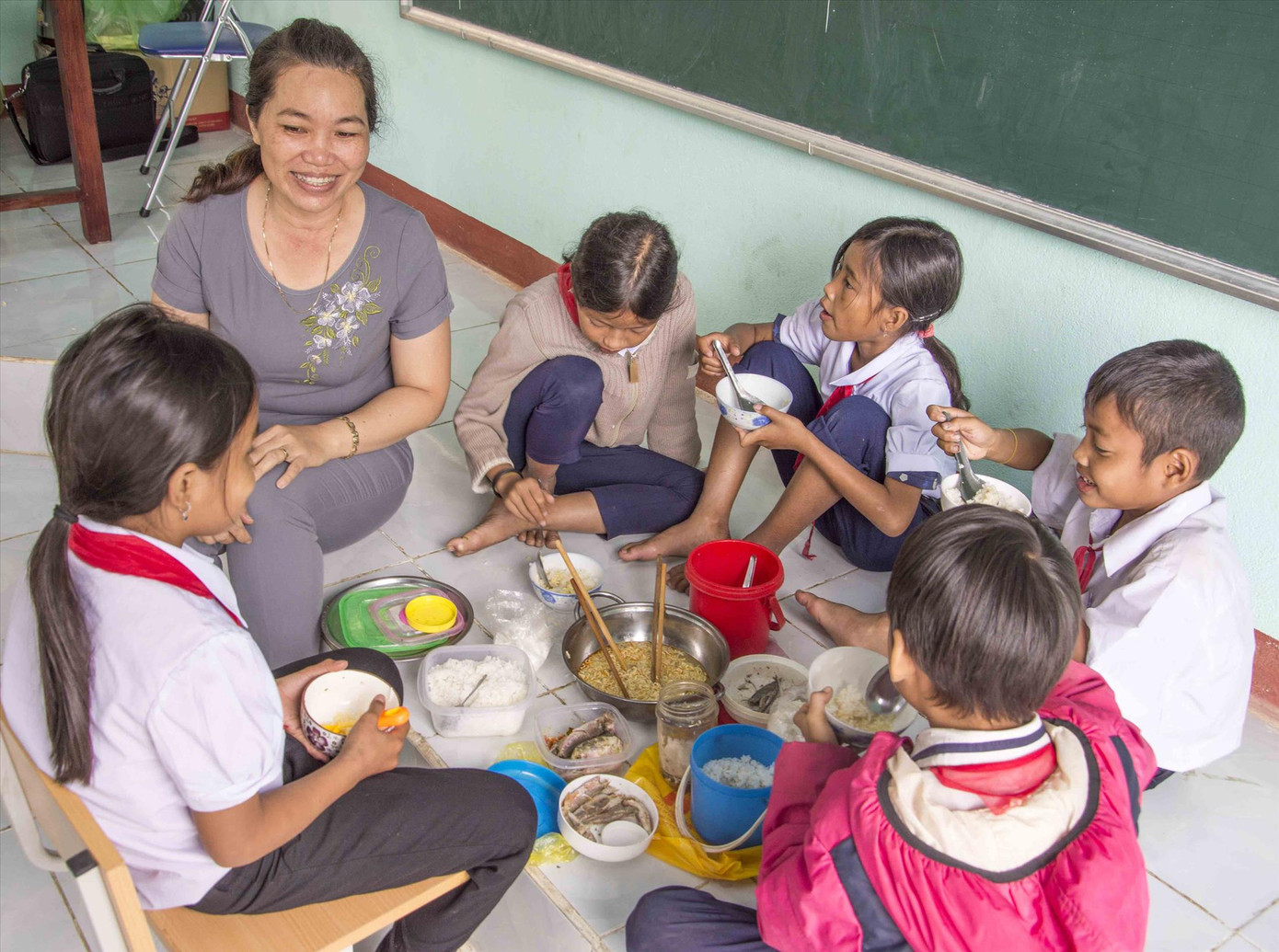 Sau giờ học, cô Hương và cô giáo Loan ở phòng học cạnh nấu mì tôm và gọi học sinh. Để hòa nhập với học trò thì ngoài giờ học, các thầy cô nói tiếng Cor, “xa bang (ăn trưa)” – các cô mời gọi học trò.