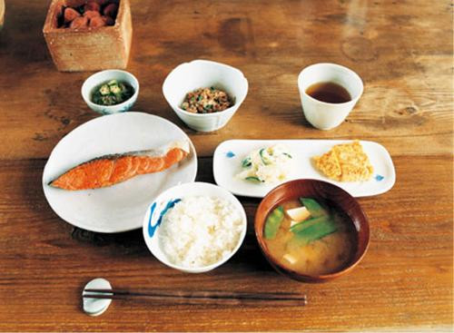 Một bữa sáng thông thường của gia đình người Nhật rất đa dạng món ăn với một quả trứng, một miếng cá tuyết, thịt lợn, 2 con tôm, rong biển, hoa quả, bát canh và một ít cơm.