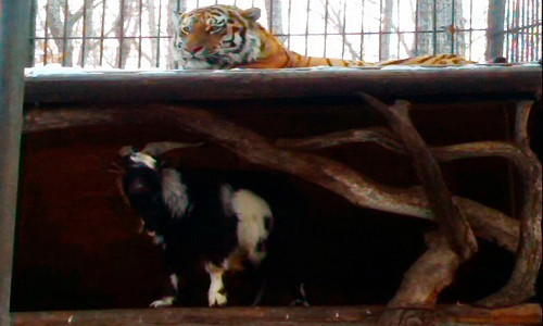 Thông thường, loài hổ không hề đắn đo chén ngay con mồi sống đặt trong chuồng của chúng. Tuy nhiên, những bức ảnh chỉ ra con hổ ngoan ngoãn nằm trên mái chòi để nhường chỗ nằm cho dê, Siberian Times hôm qua đưa tin.