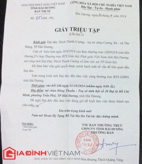 Giấy triệu tập lần 2 mời tôi lên họp vào hồi 14h ngày 1/10/2014 (tức ngày 9/9 âm lịch). Tuy nhiên, giấy triệu tập này đánh máy sai cụ thể, nếu là ngày 1/10/2014 dương lịch thì ngày âm lịch là ngày 8/9; còn ngày 2/10/2014 dương lịch mới là ngày 9/9 âm lịch, như vậy giấy triệu tập của Ban Trị sự Giáo hội phật giáo Việt Nam tỉnh Hải Dương đã ghi sai ngày, nếu vậy tôi biết đi họp vào ngày nào.