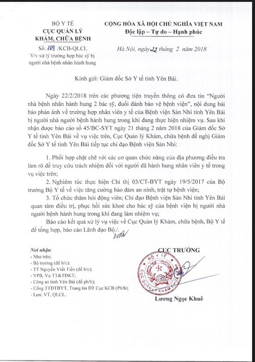 Công văn của do PGS.TS Lương Ngọc Khuê- Cục trưởng Cục Quản lý Khám chữa bệnh, Bộ Y tế ký ban hành cho biết, ngày 22/2/2018 trên các phương tiện truyền thông có đưa tin “Người nhà bệnh nhân hành hung 2 bác sỹ, đuổi đánh bảo vệ bệnh viện”, nội dung bài báo phản ánh về trường hợp nhân viên y tế của BV Sản Nhi tỉnh Yên Bái bị người nhà người bệnh hành hung trong khi đang thực hiện nhiệm vụ.