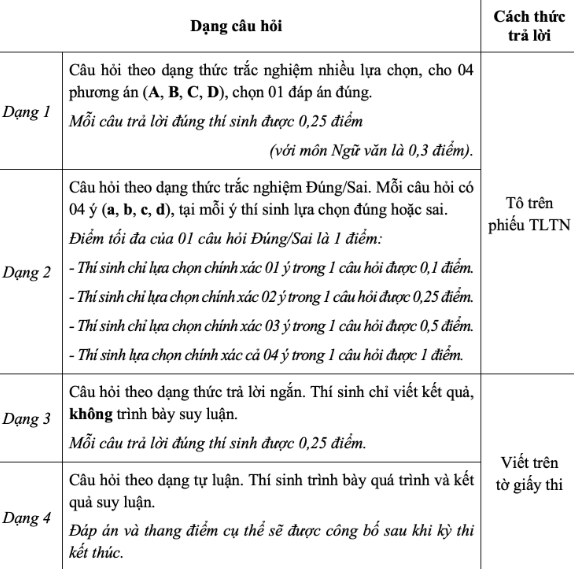 Đề thi kết hợp các dạng câu hỏi trắc nghiệm và tự luận với tỷ lệ điểm phù hợp theo cấu trúc từng bài; đánh giá mức độ thông hiểu kiến thức cốt lõi và năng lực lập luận, phân tích, đánh giá, giải quyết vấn đề và sáng tạo. Thí sinh làm bài trực tiếp tại phòng thi, trả lời các câu hỏi bằng cách tô trên phiếu trả lời trắc nghiệm và viết trên tờ giấy thi.
