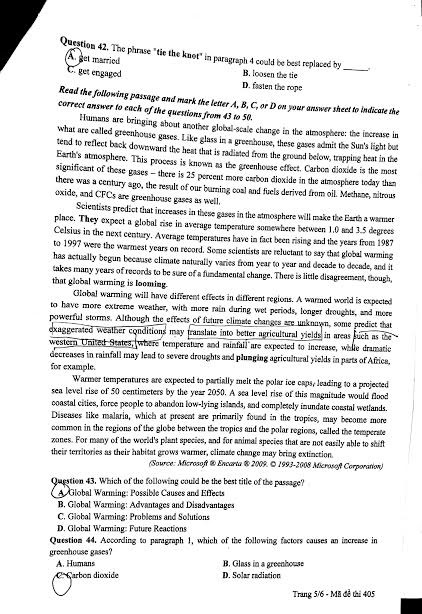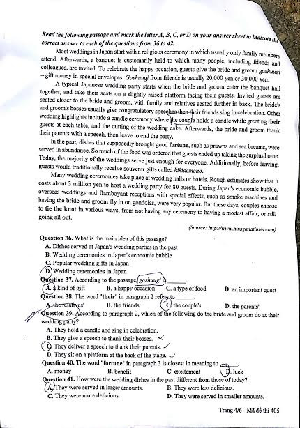 Mỗi đề thi đều xuất hiện các câu hỏi “khó” là các câu có tính phân loại, dùng để lấy điểm 9,10 nhưng hầu hết không có câu hỏi xa lạ, đánh đố. Cụ thể là các câu rơi vào bài Đọc hiểu số 2 (câu 43 đến 50 của mã đề 405, câu 35 đến 42 của mã đề 416). Tuy nhiên, các chủ đề xuất hiện trong đề thường là các chủ đề quen thuộc, không xa lạ với quá trình học và ôn tập của học sinh.