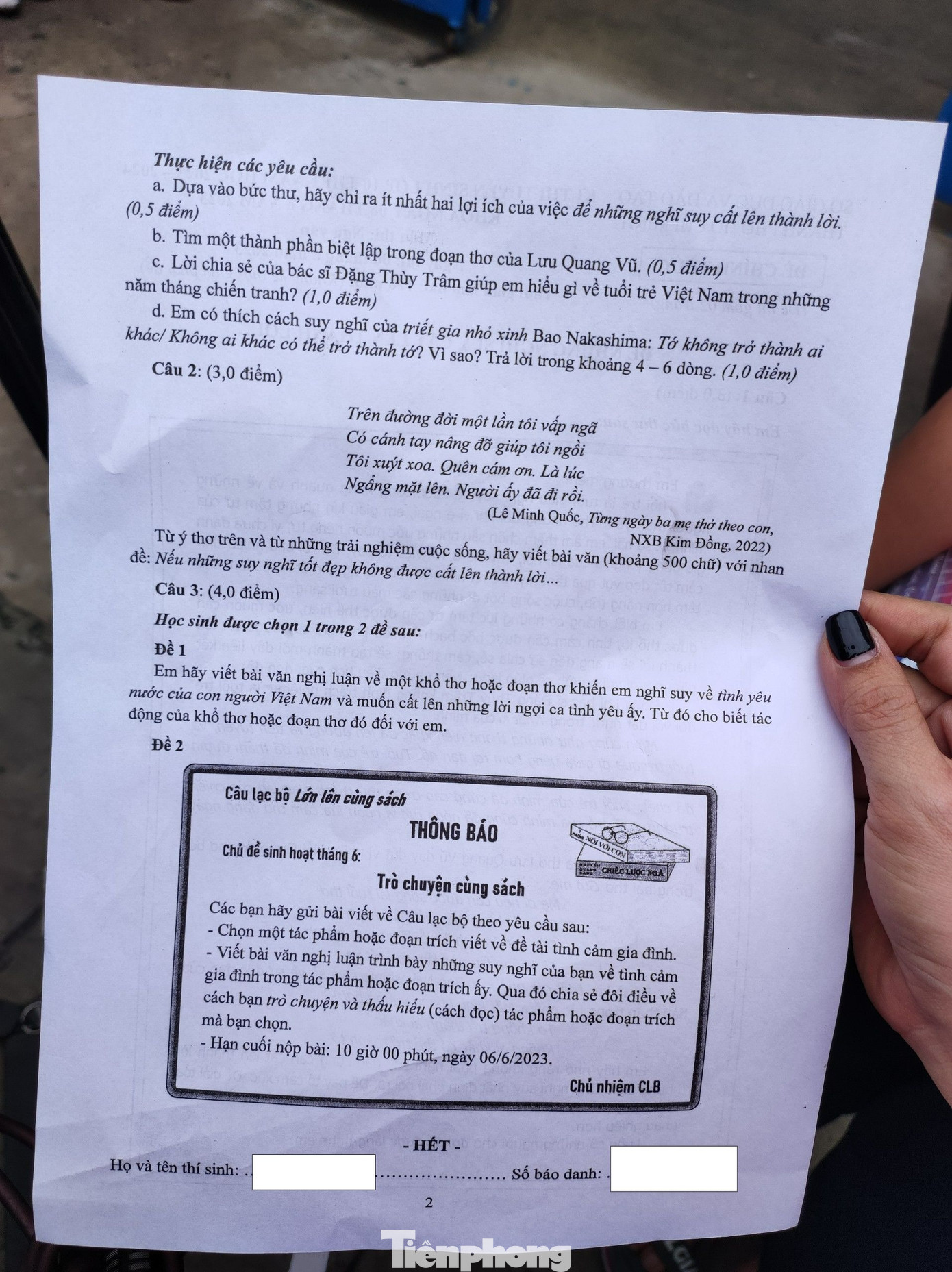 | Câu 3 – Đề 2 (Nghị luận văn học) | - Chủ đề là tình cảm gia đình, đề khá rộng như đề 1. - Đề không giới hạn thơ hay truyện, HS có thể chọn bất kì tác phẩm nào đúng chủ để, ở bất kì thể loại nào. - Sự khác biệt với đề 1 là ở yêu cầu phụ: chia sẻ về cách đọc, cách hiểu tác phẩm mình chọn. Yêu cầu phụ này không khó, HS được trình bày quan điểm của mình 1 cách tự do. Nhưng với những HS quen học văn mẫu, tư duy rập khuôn sẽ không hiểu yêu cầu này. |