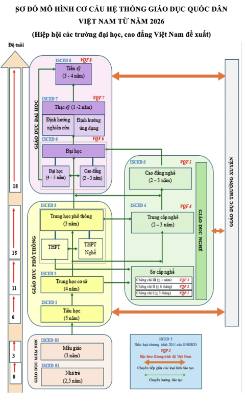 Mô hình hệ thống giáo dục quốc dân từ năm 2026 mà Hiệp hội Các trường ĐH, CĐ Việt Nam đề xuất cụ thể như sau: