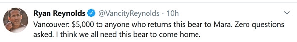 Hiện cộng đồng mạng cũng chia sẻ thông tin của Soriano với hy vọng sớm có người trả cho cô con gấu bông. Diễn viên Ryan Reynolds cũng khẳng định, chỉ cần có người trả gấu, anh sẽ trả tiền mà không hỏi thêm bất kỳ một câu nào.