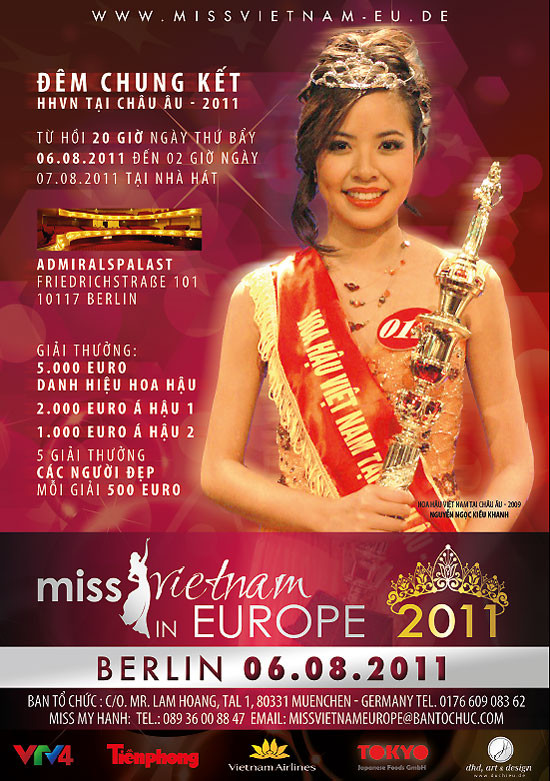 Đêm chung kết Miss Việt Nam - Eu sẽ diễn ra vào ngày 06-08-2011 tại nhà hát Admiralspalast, Berlin, CHLB Đức.