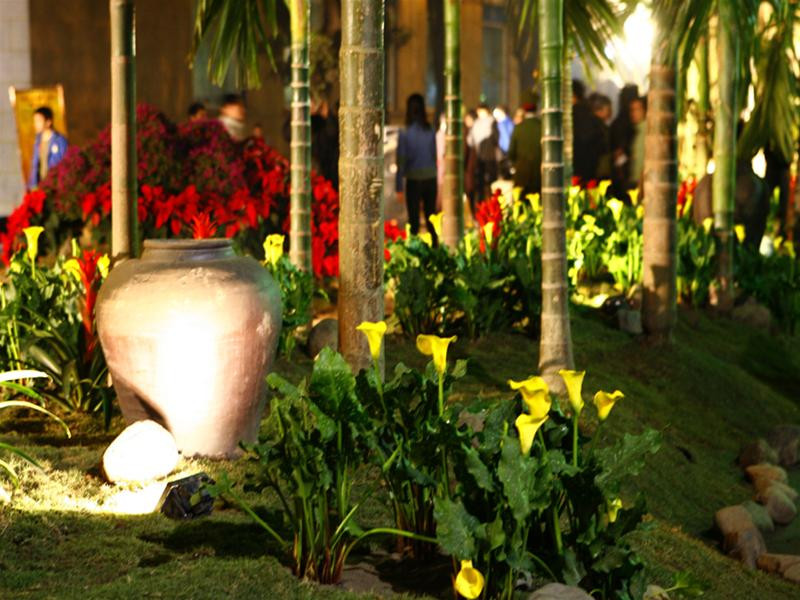 Cây cau và chum sành cũng được các nghệ nhân sử dụng bầy với vườn hoa