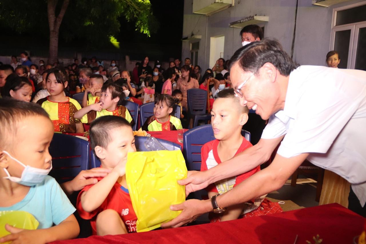 | Các đại biểu cùng BTC chương trình trực tiếp tặng quà cho trẻ em, cụ già, những người có hoàn cảnh khó khăn tại Đêm hội trăng rằm. |