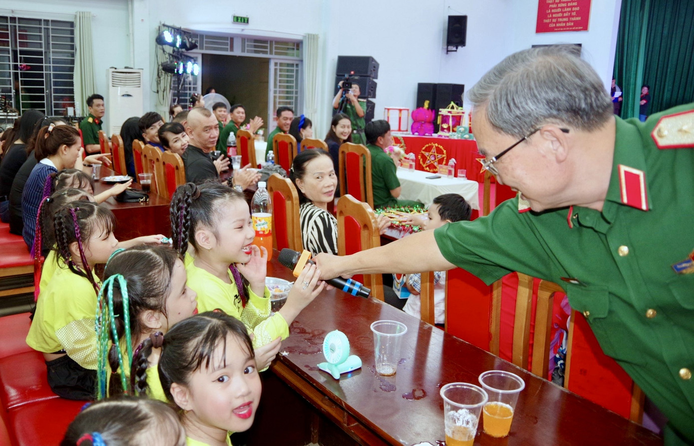 | Tại đêm hội, Trung tướng Phạm Văn Dỹ - nguyên Chính ủy Quân khu 7 và Trung tá Ngô Công Tâm (Ban Chỉ huy quân sự Quận 6, TPHCM) đã trổ tài văn nghệ, gửi những lời yêu thương tới các mầm non tương lai. |