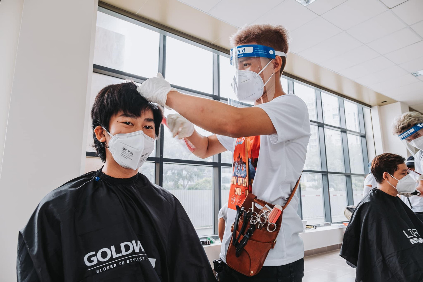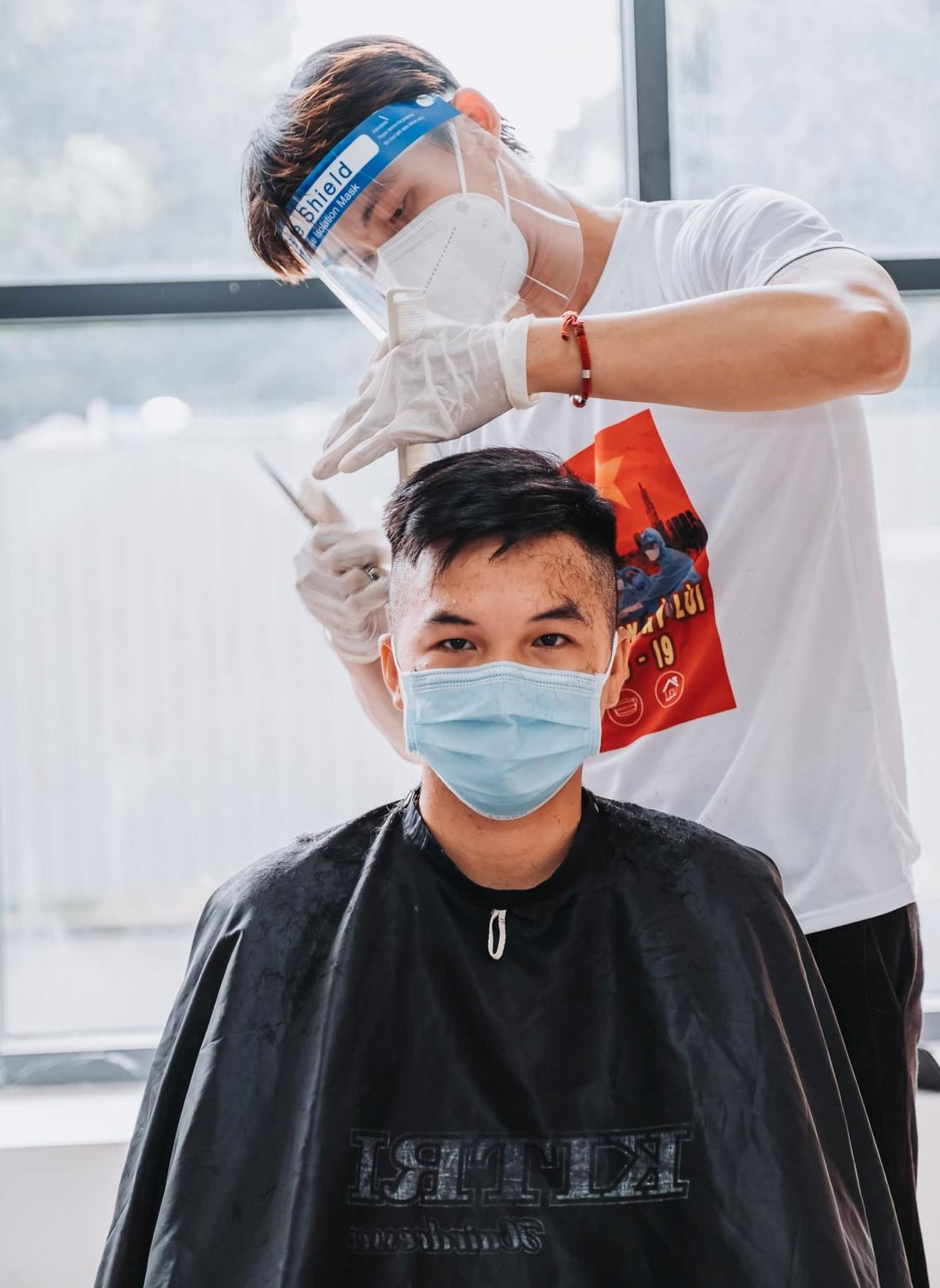 | Các văn nghệ sỹ chung tay mang lại mái tóc mới gọn gàng, đẹp đẽ cho các nhân viên y tế. (Ảnh: Neih Nguyen) |