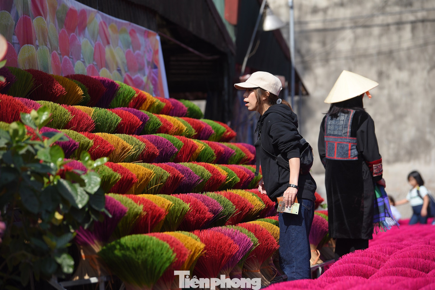 Nếu may mắn đến làng hương vào đúng ngày nắng đẹp, chỉ cần đi dạo quanh một vòng là bạn sẽ dễ dàng nhìn thấy hình ảnh người dân phơi tăm hương. Lúc này, những bó tăm hương đỏ tựa đóa hoa khổng lồ được phơi khắp sân nhà, sân đình và cả các bãi đất trống, vẽ nên bức tranh rực rỡ giữa nền trời trong vắt.