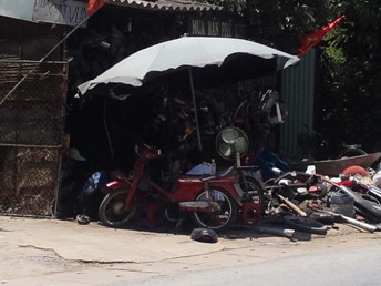 Đi dọc đường dẫn vào làng, chúng tôi như lạc vào bãi xác xe khổng lồ với không biết cơ man nào là xe máy. Hầu hết, chúng được mổ bung ra, khung nằm đường khung, lốp nằm đường lốp… lấn ra cả lối đi.