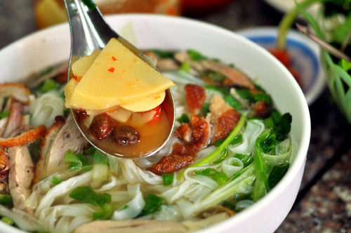Kết hợp hai món ăn ngon này mang đến một hương vị khác lạ. Thay vì thịt bò hay gà như thường thấy, nguyên liệu nổi bật của bát phở là những miếng thịt vịt quay chín mềm, đậm đà, hấp dẫn với lớp da đỏ mỡ màng. Các món phở Hà Nội thường ăn kèm quẩy, thì món ăn đặc biệt này lại kèm măng chua ngâm sẵn với rau húng thơm nồng. Vị chua cay của măng đưa đẩy chút béo ngọt từ thịt vịt.