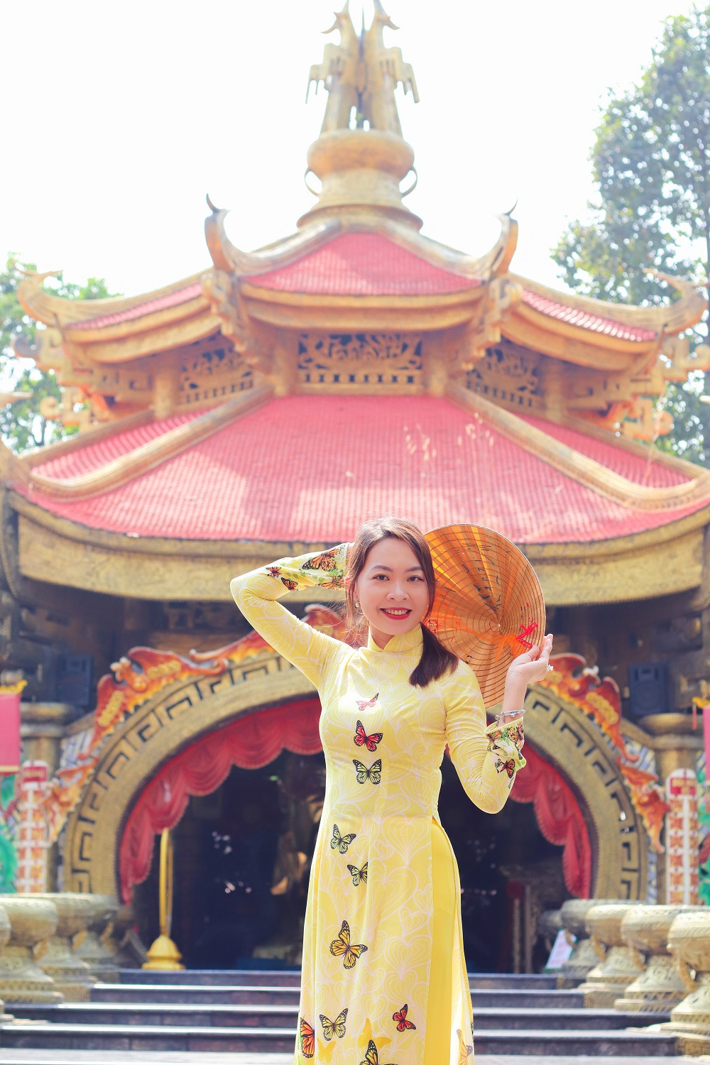 | Nữ du khách xúng xính áo dài truyền thống thả dáng bên Đền Hùng, Cây Ước Nguyện. |