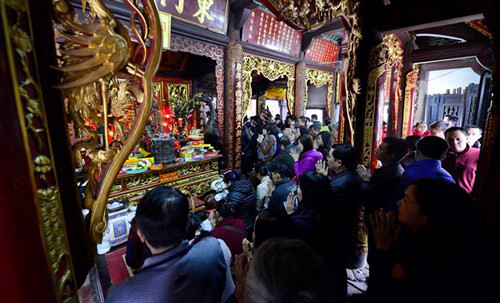 Trong khuôn viên đền Trần, hàng trăm du khách thập phương khệ nệ những mâm lễ trên vai, túi ny lon to nhỏ đến thắp hương khấn vái. Dòng người đôi lúc có hiện tượng chen lấn nhau để được đặt đồ lễ lên trước. Đôi khi, có du khách “tranh thủ” với tay sờ vào thanh kiếm trên bàn lễ như một cách lấy may cho mình.