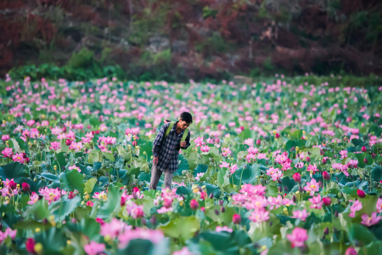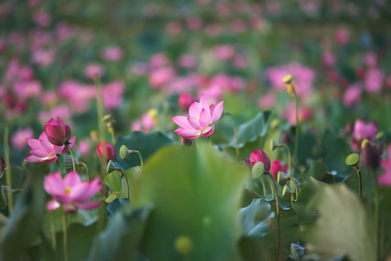 Dập dìu giữa bát ngát sen hồng trong nắng mới tinh khôi. Ảnh: Nguyễn Trình.