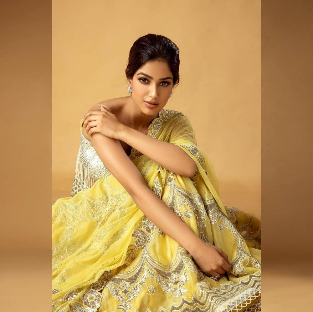 | Harnaaz đẹp như nữ thần trong trang phục truyền thống của người Ấn Độ. |