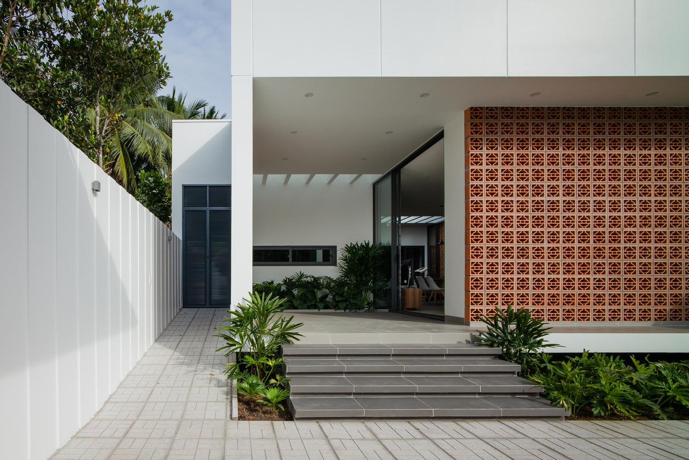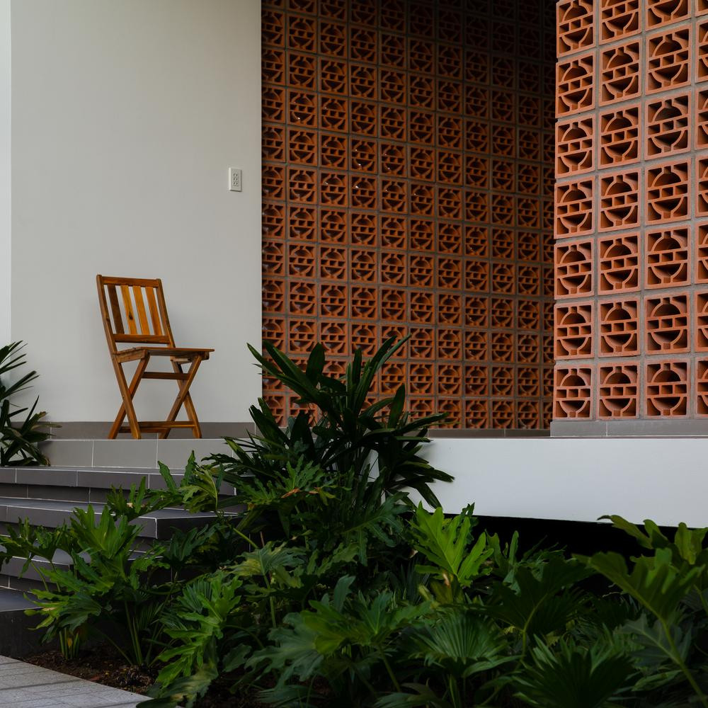 | Công trình sử dụng gạch thông gió đất nung, màu gỗ trầm trên nền sơn trắng kết hợp mảng xanh tạo nên nét hiện đại, pha chút mộc mạc hòa mình vào thiên nhiên, mang lại cảm giác ấm áp và thư thái cho gia đình. |