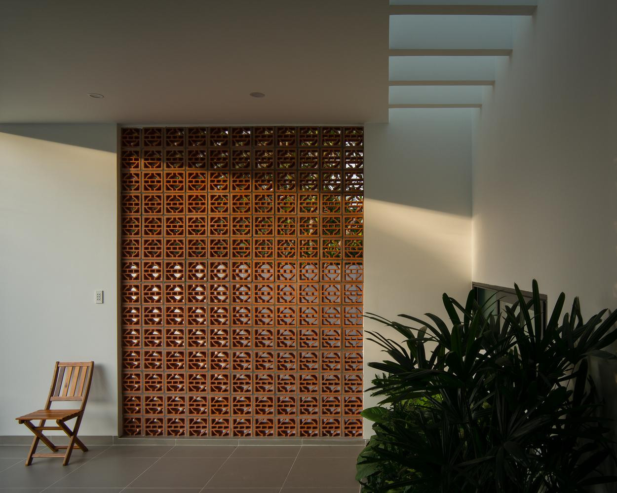 TPO - Công trình sử dụng gạch thông gió đất nung, màu gỗ trầm trên nền sơn trắng kết hợp mảng xanh tạo nên nét hiện đại, pha chút mộc mạc hòa mình vào thiên nhiên, mang lại cảm giác ấm áp và thư thái cho gia đình.