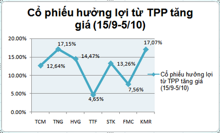 Đón đầu cuộc họp kết thúc đàm phán hôm qua tại Alanta (Mỹ), hàng loạt mã dệt may ghi nhận đà tăng giá mạnh trong giai đoạn 15/9-5/10. Cổ phiếu Dệt may đầu tư thương mại Thành Công (Mã CK: TCM) tăng 12,64% lên 38.000 đồng; Đầu tư và thương mại TNG (Mã CK: TNG) tăng 17,15% lên 28.000 đồng; Mirae (Mã CK: KMR) tăng 17,07% lên 4.800 đồng... Dù mới niêm yết ngày 30/9, cổ phiếu của Sợi Thế Kỷ (Mã CK: STK) đã tăng 13,26% lên 35.000 đồng trước kỳ vọng doanh nghiệp có thể hưởng lợi khi TPP yêu cầu chặt chẽ về nguồn gốc nguyên liệu dệt may.
