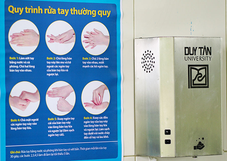 Thiết bị Hướng dẫn bằng giọng nói quy trình rửa tay đúng cách được các cán bộ của Phòng Nghiên cứu Điện-Điện tử & Doanh nghiệp của ĐH Duy Tân nghiên cứu và chế tạo nhằm giúp cho mọi người thực hiện đầy đủ và đúng các thao tác trong khi rửa tay theo quy trình của Bộ Y tế. Thiết bị hướng dẫn rửa tay của ĐH Duy Tân tích hợp hệ thống bơm nước rửa tay và vòi nước tự động với các cảm biến nhận biết người khi đứng trước lavabo rửa tay, cảm biến nhận biết khi đưa tay vào rửa, lấy nước rửa tay,… Sau khi thu thập tín hiệu, thiết bị sẽ đưa ra lời cảnh báo, hướng dẫn mọi người đúng cách rửa tay. Thiết bị này có thể hoạt động được bằng pin hoặc điện và rất nhỏ gọn.