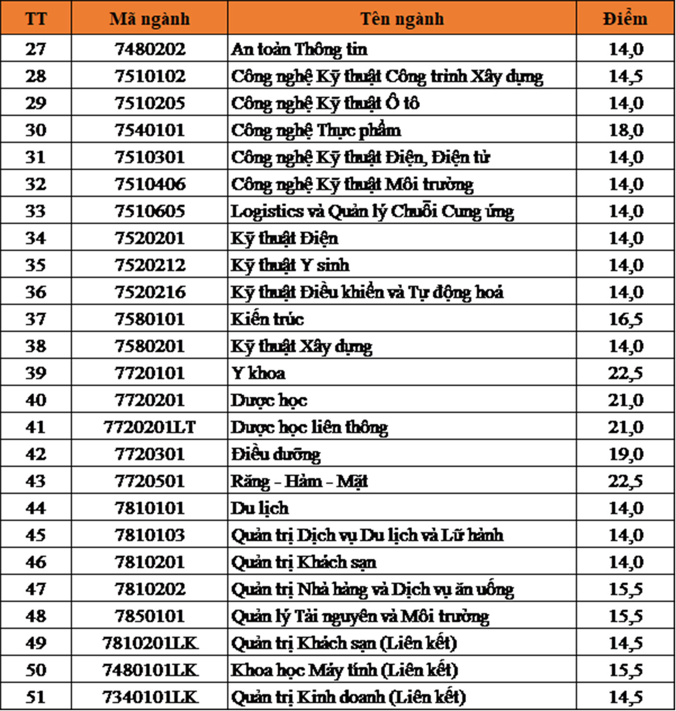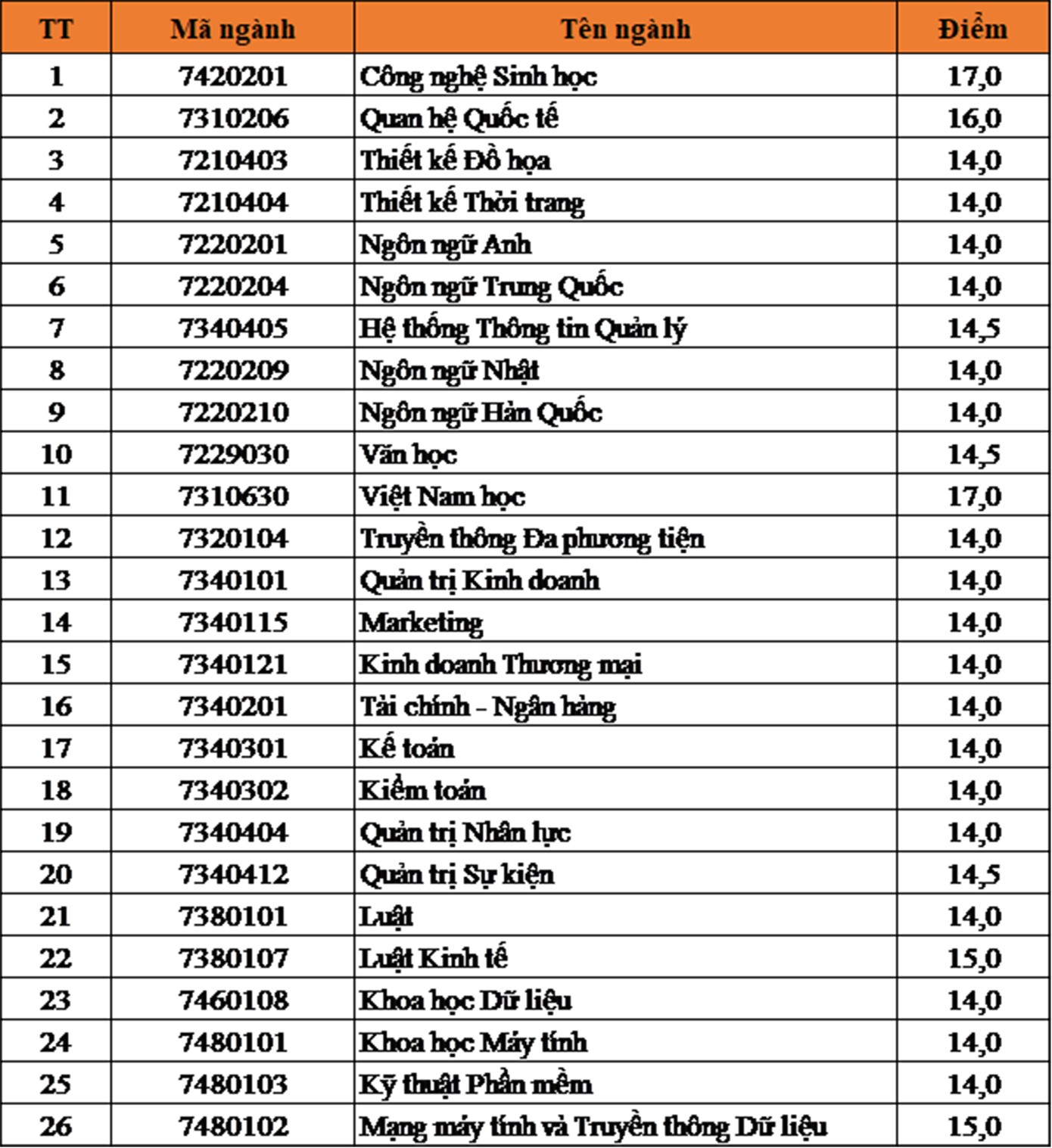 I. Mức Điểm chuẩn dao động từ 14 đến 22.5 điểm theo từng ngành, cụ thể: