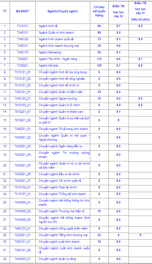 Theo đó, ngoài tiêu chí học sinh giỏi, điểm số năm lớp 12 tại các trường THPT chuyên, năng khiếu trên cả nước, trường Đại học Kinh tế TPHCM còn đưa ra tiêu chí phụ với một số ngành có mức cạnh tranh cao. Tiêu chí phụ là điểm trung bình học lực năm lớp 11.