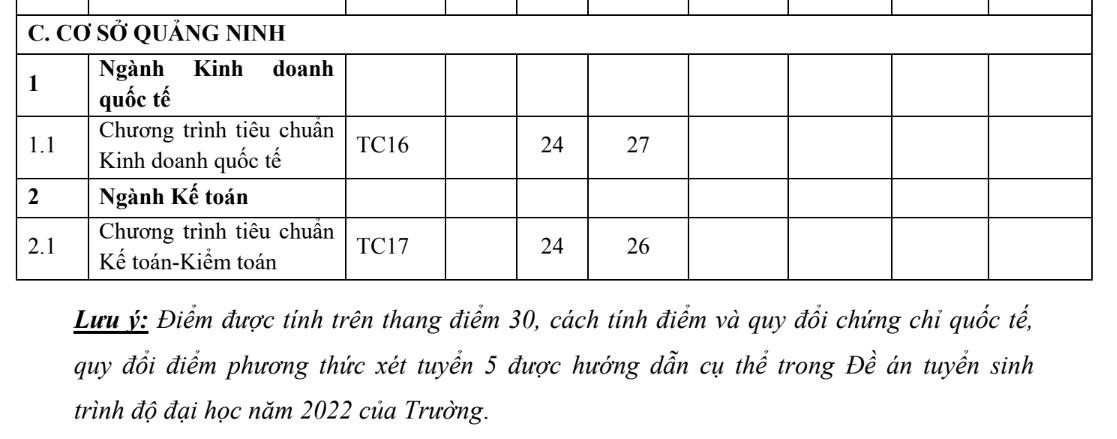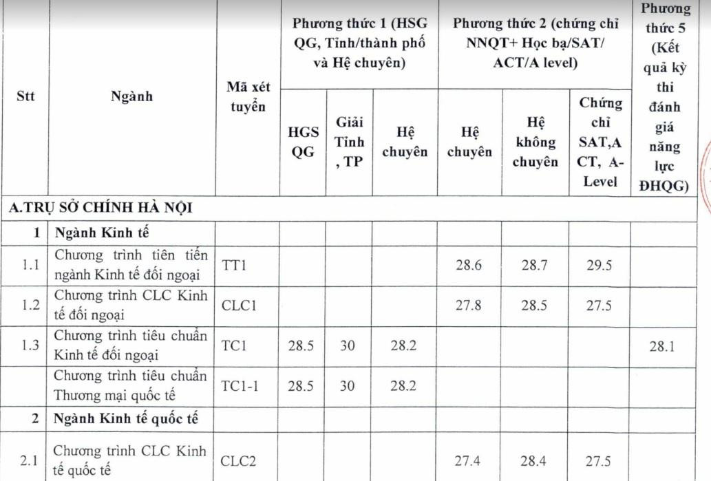 Các phương thức có điểm trúng tuyển gồm: phương thức 1 (xét học sinh giỏi quốc gia, học sinh giỏi tỉnh, học sinh chuyên); phương thức 2 (chứng chỉ ngoại ngữ quốc tế kết hợp với kết quả học bạ); phương thức 5 (điểm thi đánh giá năng lực của 2 Đại học Quốc gia).