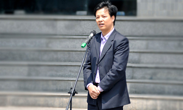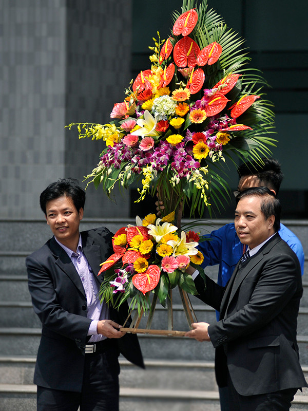 PGS.TS Bùi Anh Tuấn – Bí thư Đảng ủy, Hiệu trưởng Trường ĐH Ngoại thương (bên phải) phát biểu chúc mừng và tặng lẳng hoa tươi thắm tới Đoàn Thanh niên Trường ĐH Ngoại thương, qua đó, thể hiện sự tin tưởng thế hệ trẻ của nhà trường.