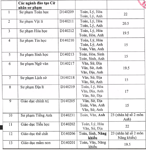 Điểm chuẩn các ngành đào tạo cử nhân Sư phạm