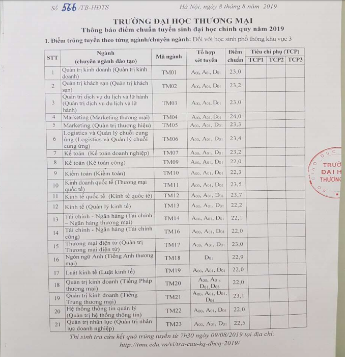 Điểm chuẩn năm 2020 của Đại học Thương mại: