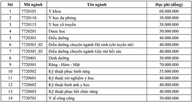 Các ngành Điều dưỡng, Điều dưỡng chuyên ngành hộ sinh, Điều dưỡng chuyên ngành gây mê hồi sức, Kỹ thuật xét nghiệm y học, Kỹ thuật phục hồi y học, Kỹ thuật phục hồi chức năng là 40 triệu đồng/ năm, ngành Y học dự phòng và Y học cổ truyền 38 triệu đồng/ năm, ngành Dinh dưỡng và Y tế cộng đồng thấp nhất là 30 triệu đồng/ năm.