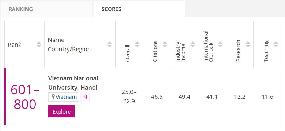 Trong đó, ĐHQG Hà Nội duy trì vị trí trong top 601-800 của lĩnh vực Khoa học cơ bản (Physical Sciences) so với THE WUR by Subject 2021. Ba lĩnh vực khác cũng đã công bố kết quả bao gồm Clinical and Health, Life sciences và Psychology.