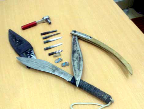 Ngoài 2 con dao nhọn bằng thép tự chế là hung khí để chống trả lực lượng chức năng, kiểm tra tại chỗ, Tổ công tác còn phát hiện trong túi quần của 2 đối tượng có một tay công cùng rất nhiều các đầu vam chuyên dụng để phá khóa xe máy.
