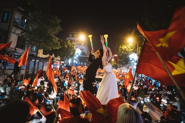 Tối 23/1, hàng triệu người xuống đường ăn mừng chiến thắng của U23 Việt Nam sau trận bán kết lịch sử. Cờ đỏ sao vàng ngợp trời tạo nên cảnh tượng đầy xúc động và tự hào. Giữa khoảnh khắc tuyệt vời khi đám đông reo hò, một cặp đôi trở thành tâm điểm khi có màn cầu hôn, chụp ảnh cưới "độc nhất vô nhị".